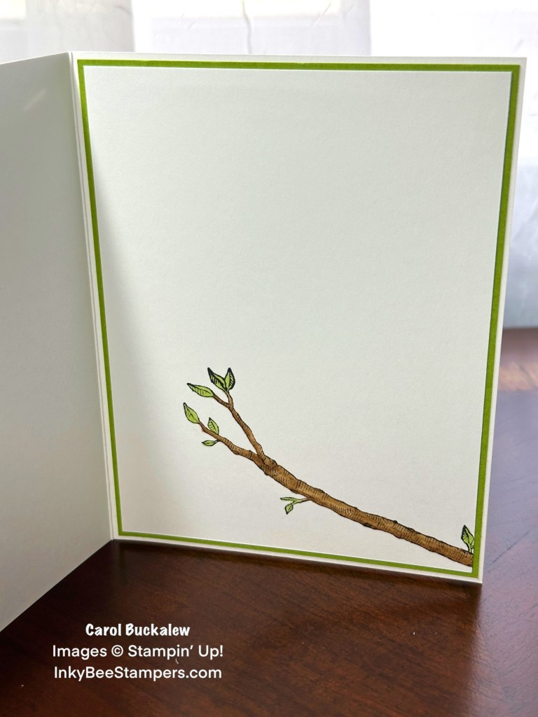 On the inside panel, I kept it simple by stamping the branch in Tuxedo Black Memento ink onto the bottom of the panel. The image was then colored in with Stampin’ Blends. The panel was adhered to a Granny Apple Green mat and adhered to the inside of the card.