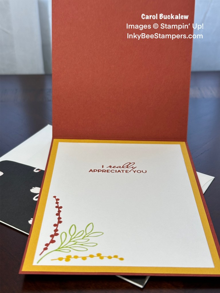 An additional sentiment was stamped on the inside panel and I stamped several greenery images in the lower corner in Cajun Craze, Granny Apple Green and Crushed Curry. The panel was adhered to a Crushed Curry mat, then adhered to the inside of the card.