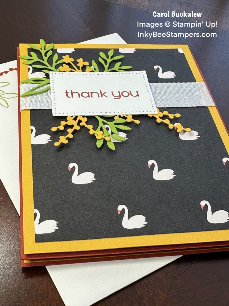 I started off with a panel of the swan print against a black background and this panel was matted to a Crushed Curry mat. Before adhering the panel to the card front, I wrapped a length of Herringbone Ribbon around the top of the panel (this ribbon is also retiring at the end of April). The ends were secured to the back of the panel using Stampin’ Seal. The panel was then adhered to the front of a Cajun Craze card base using Stampin’ Dimensionals.