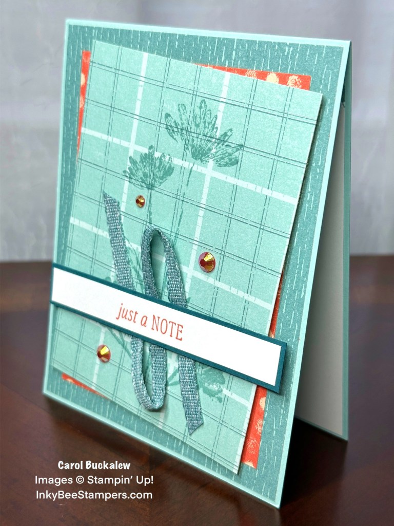 My card today is one of those “pretty doesn’t need to be complicated” cards! I selected a Lost Lagoon print from the Inked Botanicals Designer Series Paper pack for the background of the card front and this panel was adhered to the front of a Pool Party card base. Two more prints were selected from the pack, one in Calypso Coral and one in Pool Party. The Calypso Coral panel was adhered to the card front on top of the first panel. I used the tall floral image from the Inked & Tiled Stamp Set and stamped this image on the Pool Party print panel in Lost Lagoon ink. The smaller flower and stem image was stamped on either side of the tall flower. The panel was then adhered to the card front at an angle using Stampin’ Dimensionals so that some of the Calypso Coral print underneath showed through.