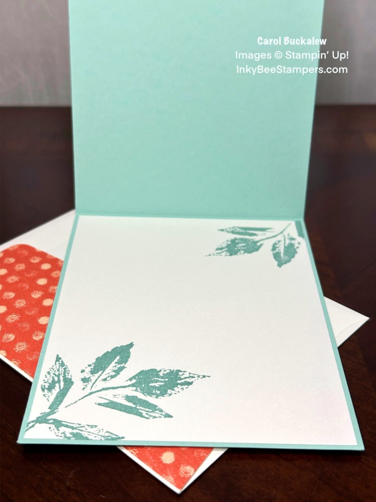 I partially stamped the large leaf image in Lost Lagoon ink onto the upper right and lower left corners of the inside panel. The panel was then adhered to the inside of the card.