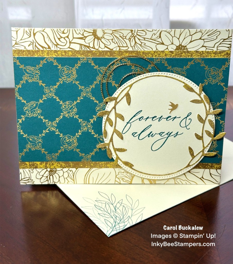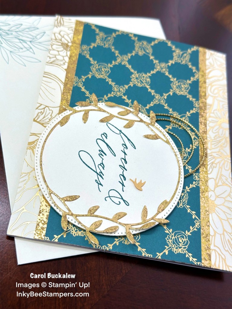 I used the largest circle die from the Stylish Shapes Dies to cut out a circle from Very Vanilla cardstock. The “Forever & always” sentiment was stamped onto the center of the circle in Pretty Peacock ink. I used the Lifetime of Love Dies to cut out the circle wreath image from Distressed Gold Specialty Paper and this was adhered to the Very Vanilla sentiment label. Before adhering the sentiment to the card front, I adhered loops of gold Simply Elegant Trim to the lower right corner of the card front, then adhered the sentiment label over top using Stampin’ Dimensionals.