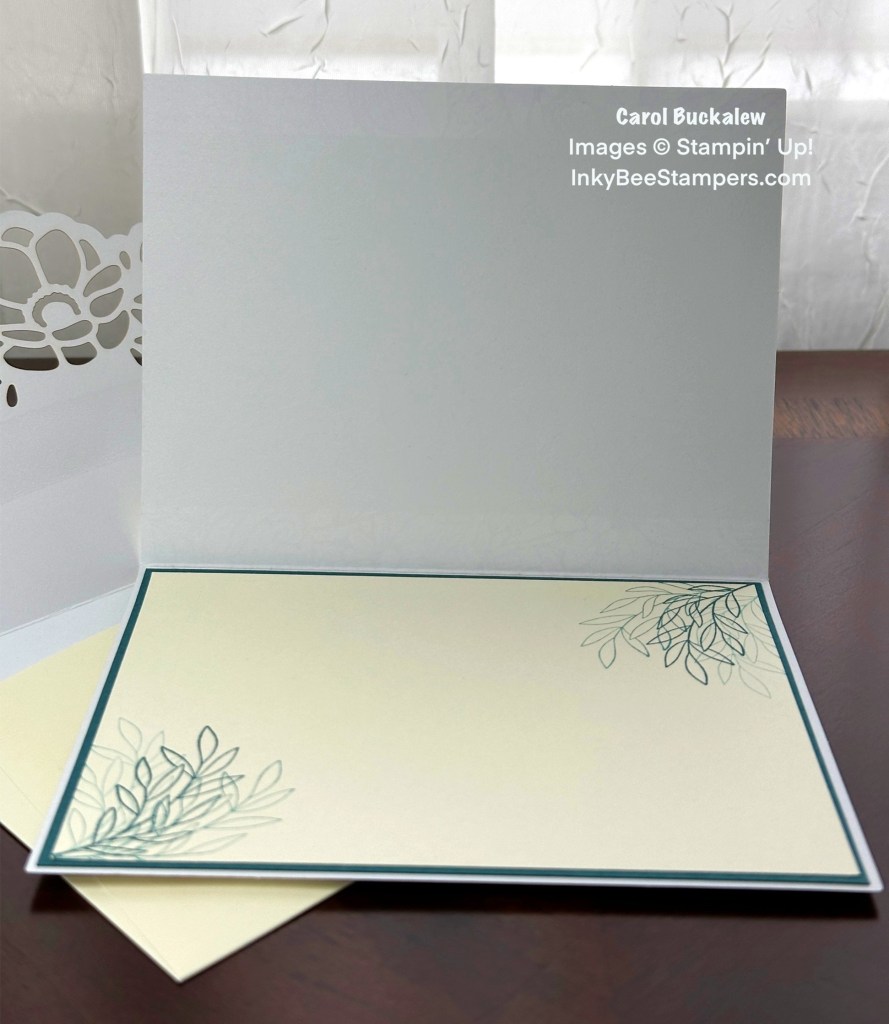I left a sentiment off of the inside panel. A sentiment can be added at a later time, depending on the need. This card is a great “I love you” card, anniversary card, or wedding card…your choice! From the Lifetime of Love Stamp Set, I did stamp the large open leaf image in the upper right corner of the panel, then stamped off two times on either side of the first stamped image in Pretty Peacock ink. I repeated this for the lower left corner. The panel was adhered to a Pretty Peacock mat, then adhered to the inside of the card.
