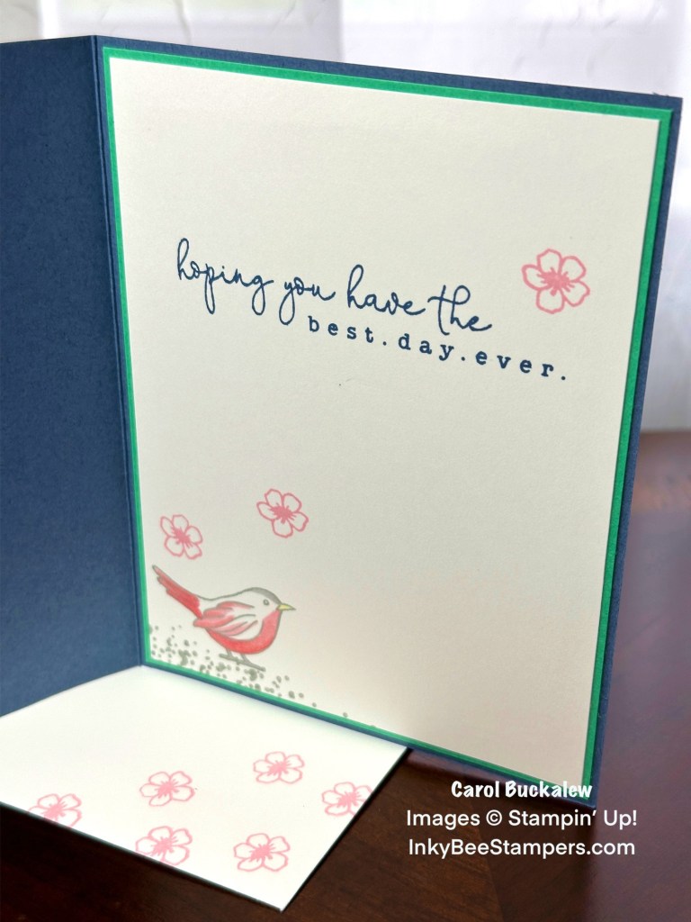 On the inside panel, I stamped an additional sentiment in Misty Moonlight. The spotted stamp was used towards the bottom of the panel and was stamped in Smoky Slate. The bird image was also stamped in Smoky Slate and I used Stampin’ Blends to color in the image. Several flowers were stamped onto the panel in Pretty in Pink ink. The panel was adhered to a Shy Shamrock mat, then adhered to the inside of the card.