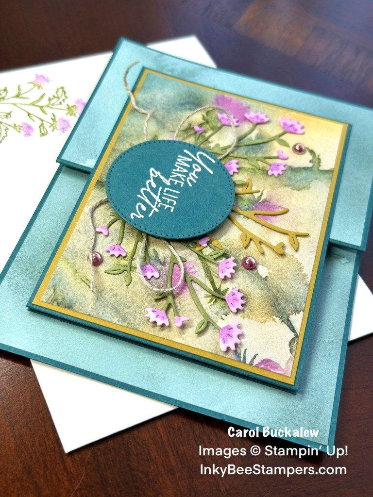 An additional sentiment was stamped onto the inside panel in Pretty Peacock ink. The thistle stamp from the Thoughtful Wishes Stamp Set was colored in using Fresh Freesia and Old Olive Stampin’ Write markers. I then huffed on the colored stamp then stamped the image onto the lower left of the inside panel. This is a great technique for creating a multi-color stamped image! The panel was adhered to a Wild Wheat mat, then adhered to the inside of the card.
