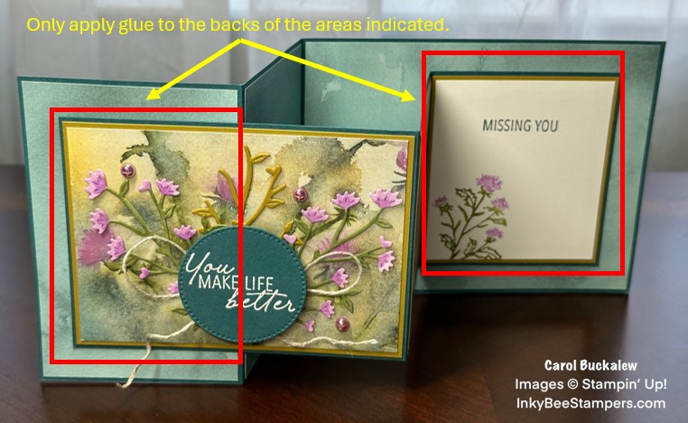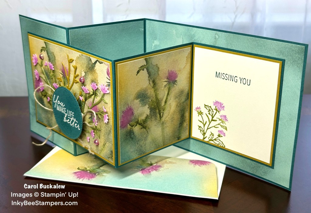 Before assembling these two card bases together to form the “Double Z”, I adhered a Lost Lagoon solid print designer series paper to the panels of the rear card base. Pretty thistle print panels from the Thoughtful Journey Designer Series Paper were adhered to Wild Wheat mats, then these were adhered to the left and center panels of the front card base. The card bases were then adhered to each other by applying liquid glue to a portion of the left panel and the back of the right panel of the front card base.
