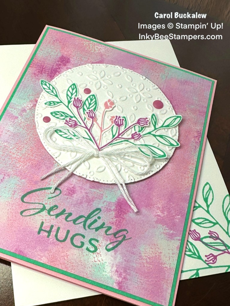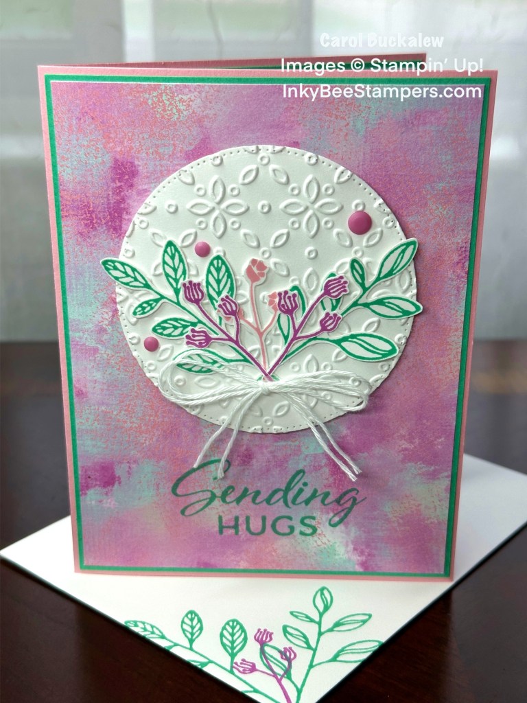 I chose a multi-colored piece of the Unbounded Beauty Designer Series Paper for this card front. The “Sending Hugs” sentiment was stamped directly onto a panel of this designer series paper, then the panel was adhered to a Shy Shamrock mat, then I adhered this to the card front. The Stylish Shapes Dies were used to cut the white circle, then I used the lovely Eyelet 3D Embossing Folder to emboss the circle. The circle was then adhered to the card front using Stampin’ Dimensionals.