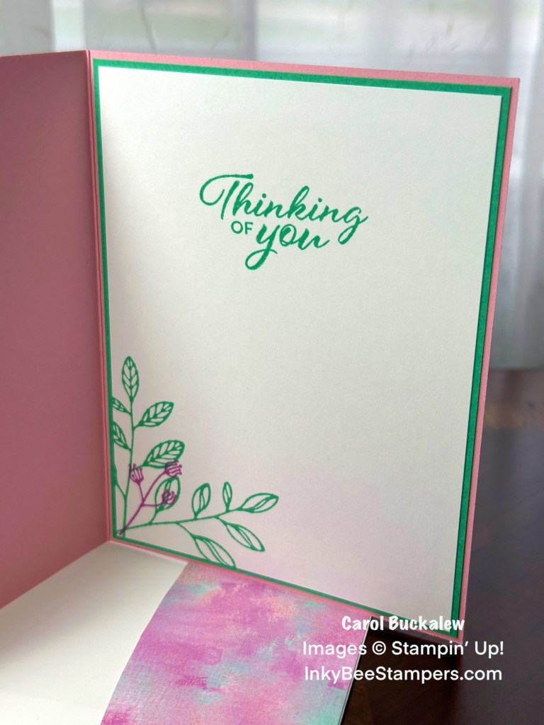 On the inside panel I stamped an additional sentiment, then stamped the leaf and flower images onto the lower left corner of the panel in Shy Shamrock and Petunia Pop. The panel was adhered to a Shy Shamrock mat, then adhered to the inside of the card.