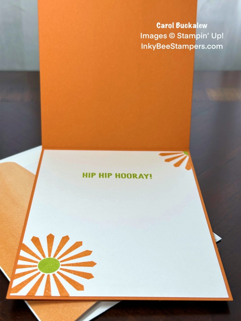 For the inside panel, I added an additional sentiment in Granny Apple Green, then I partially stamped the smaller flower image onto the upper right and lower left of the panel in Pumpkin Pie. The centers of the flowers were stamped in Granny Apple Green. The panel was then adhered to the inside of the card.
