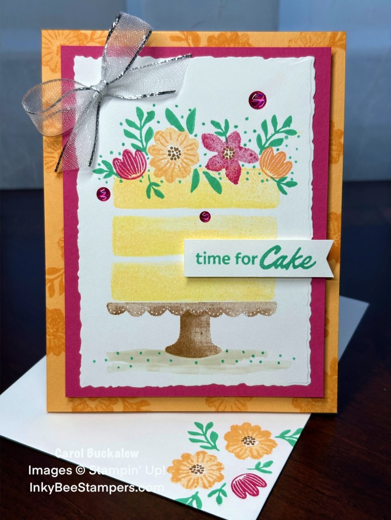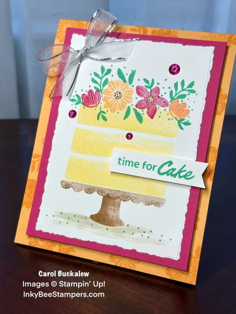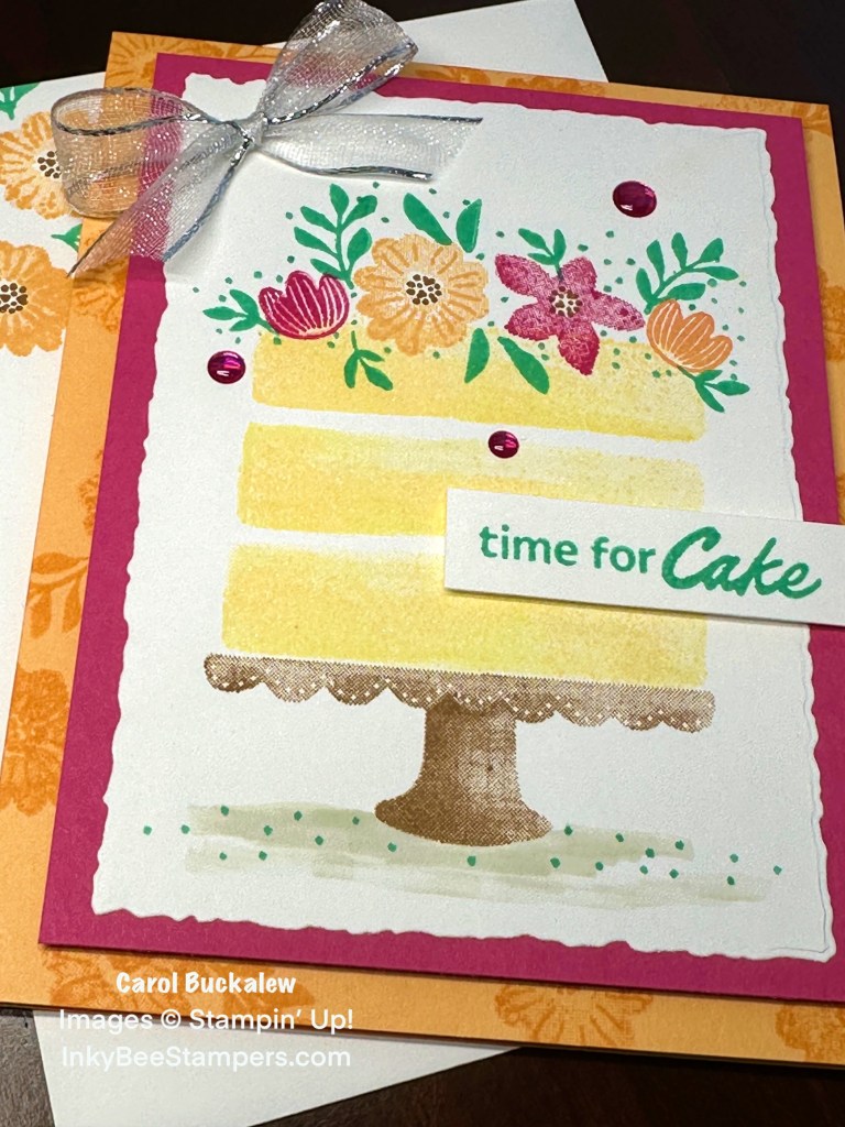 Using a little Lemon Lolly ink stamped onto an acrylic stamping block, I dipped my Wink of Stella pen into the ink and dusted the three cake layers to darken these areas a bit and to give them some sparkle. A Blender Pen was used to scribble around the cake stand using Basic Beige ink. This helps to “ground” the cake stand so it doesn’t look like it is floating. A clean Blender Pen was used to create confetti around the flowers and under the cake stand by dotting Shy Shamrock ink. From the Deckled Rectangles Dies I used the second from largest die to cut out the image. The rectangle was adhered to a Melon Mambo mat, then adhered to the card front using Stampin’ Dimensionals. The “Time for Cake” sentiment was stamped onto a white sentiment label, and this was adhered to the right of the card using Stampin’ Dimensionals.