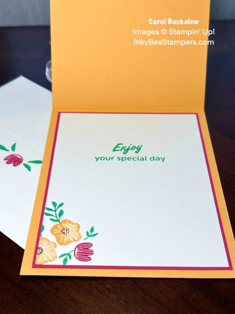 On the inside panel I used two of the sentiments – “Enjoy” and “your special day” and these were stamped in Shy Shamrock ink. Several flowers were stamped onto the lower corner of the panel in Peach Pie and Melon Mambo. The flower centers were stamped in Pecan Pie, and I stamped several leaves around the flowers in Shy Shamrock. The panel was adhered to a Melon Mambo mat, then adhered to the inside of the card.