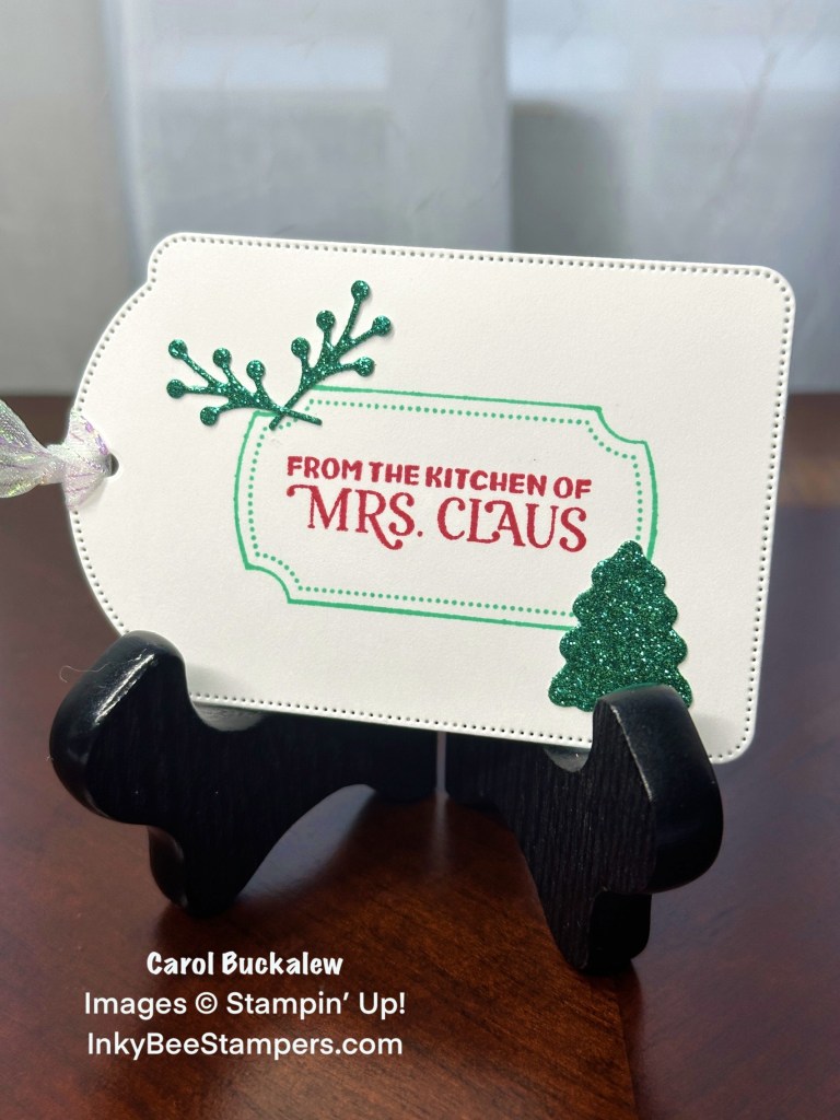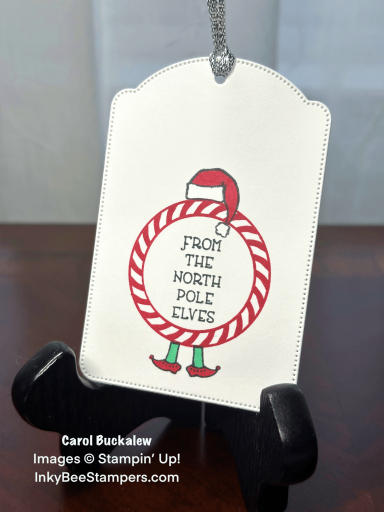 This next gift tag involves some stamping only in Real Red, Shy Shamrock and Tuxedo Black Memento ink. I used Real Red and Shy Shamrock Stampin’ Blends to color in the Santa hat and elf legs…how cute! I again used the Greetings of the Season Dies to cut out the tag and I added some Silver Trim to the top of the tag. It doesn’t get any easier than this!