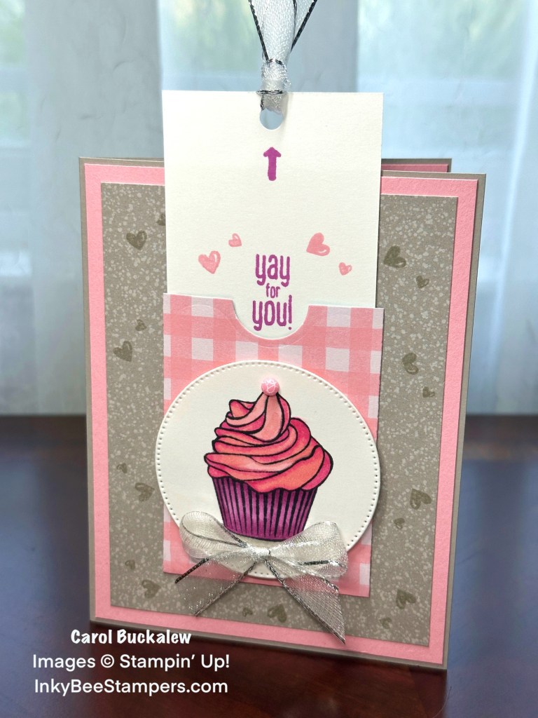 Today’s card uses the Pocket Thoughts Bundle. This bundle includes a stamp set and dies. The die set includes three dies that will cut three different sizes of pockets. Very handy when you want to create an interactive card, or a gift card holder! I went the interactive route on this card!