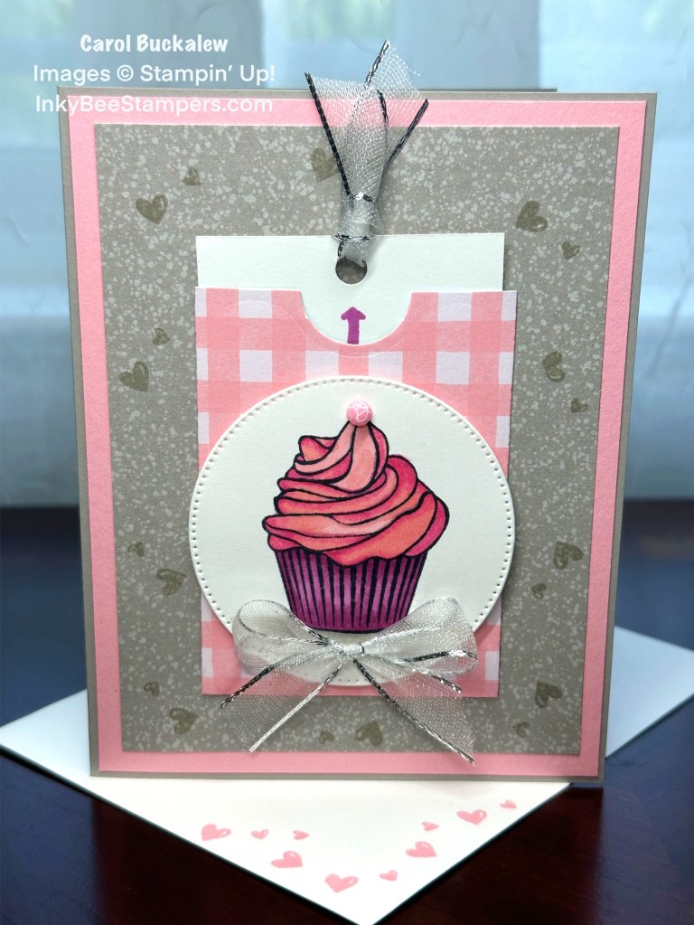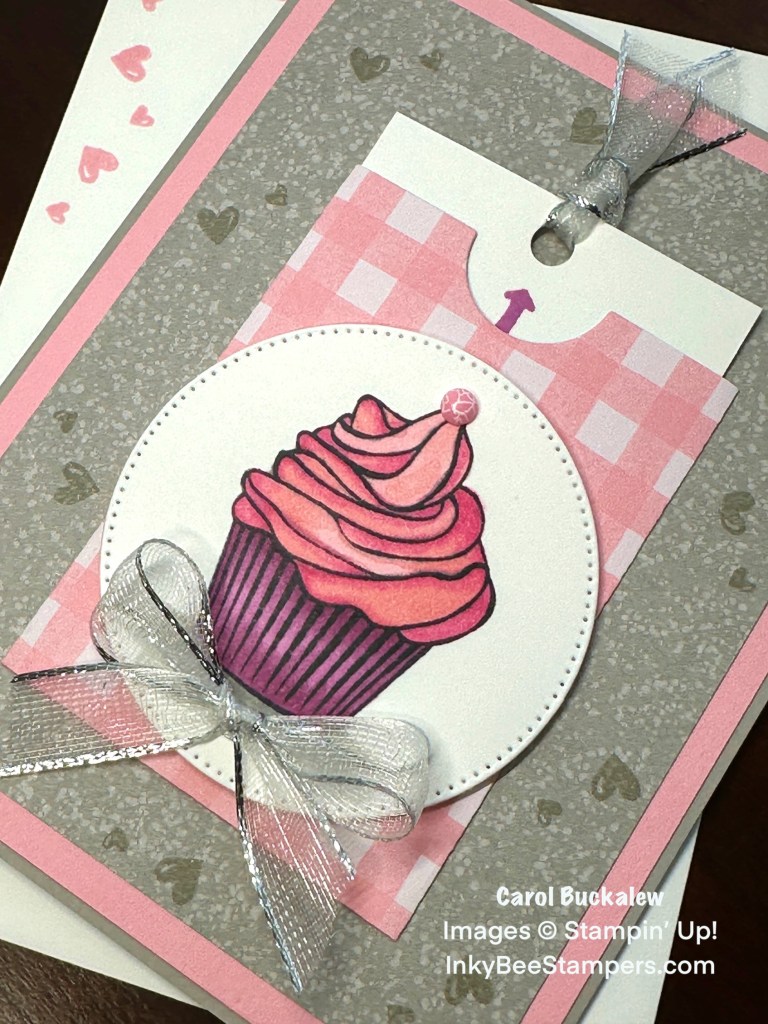 I repeated stamping of the small hearts on the envelope front and a coordinating piece of designer series paper was added to the envelope flap. I tied a small bow from Silver & White Sheer Ribbon and this was adhered just below the cupcake image on the card front using a Mini Glue Dot. A single, pink Adhesive-Backed Dappled Dot was added to the top of the cupcake to complete the card.