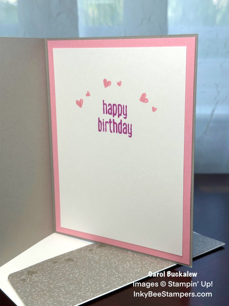 The “Happy Birthday” sentiment was stamped onto the inside panel in Petunia Pop ink and small hearts were stamped around the sentiment in Pretty in Pink ink. The panel was adhered to a Pretty in Pink mat, then adhered to the inside of the card.