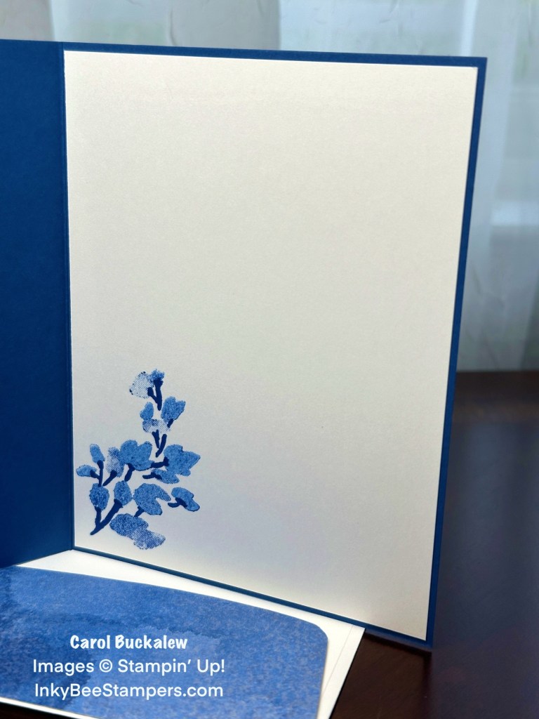 I used the two-step stamps from the Textured Floral Stamp Set to stamp the floral image onto the inside panel. The stem of the image was first generation stamped using Blueberry Bushel ink, and the flowers were second generation stamped. The panel was then adhered to the inside of the card.