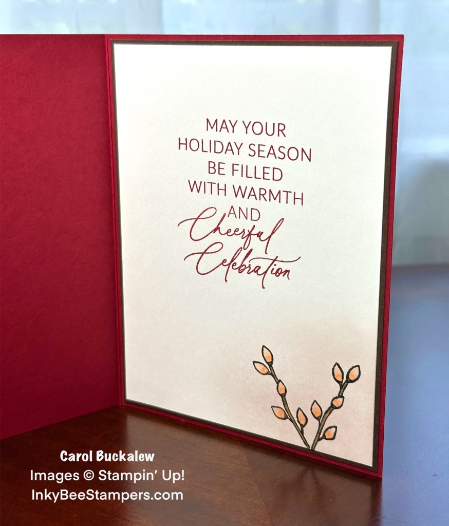 On the inside panel, an additional sentiment from the Greetings of the Season Stamp Set was stamped onto the panel. I used a Blending Brush to lightly blend Early Espresso ink onto the lower right corner of the panel, then stamped the twig image from the Winterly Tree Tops Stamp Set over top of the ink blended area. I used Stampin’ Blends to color in the images. The panel was adhered to an Early Espresso mat, then adhered to the inside of the card.