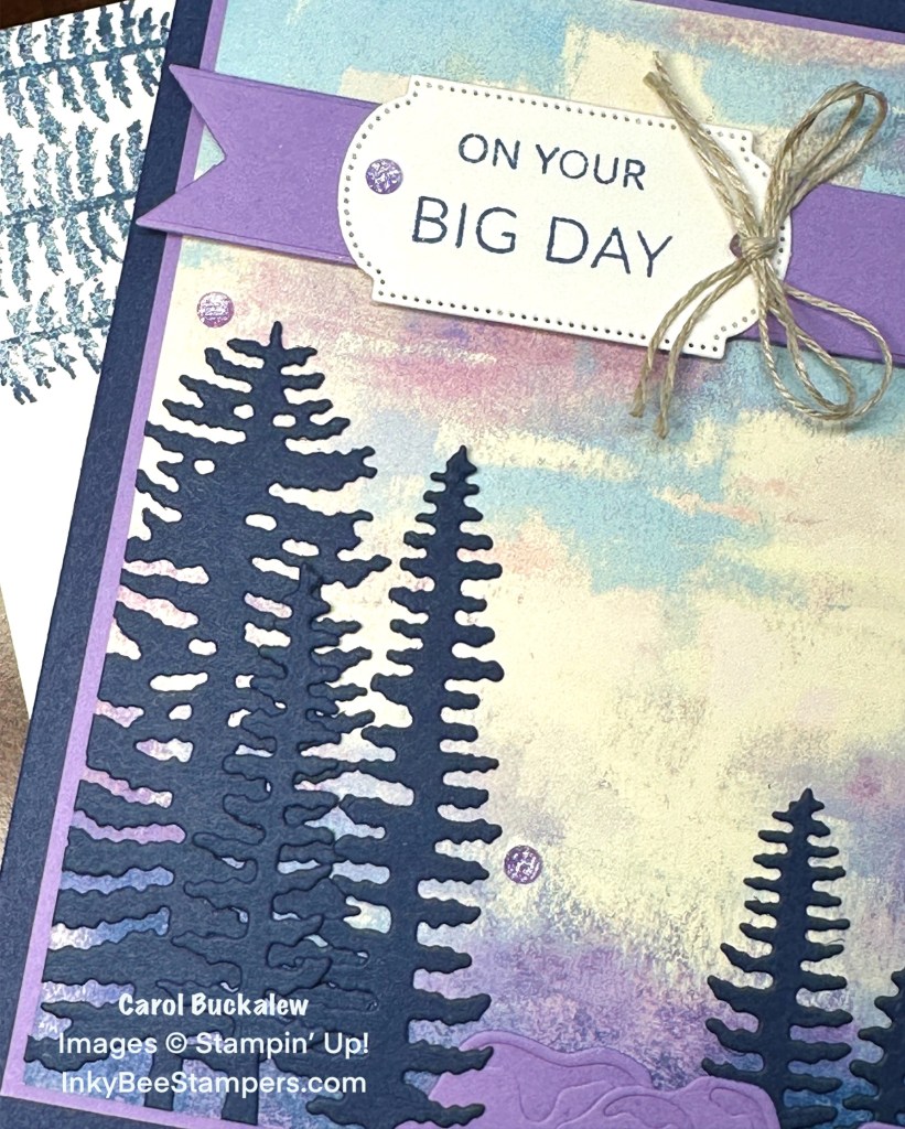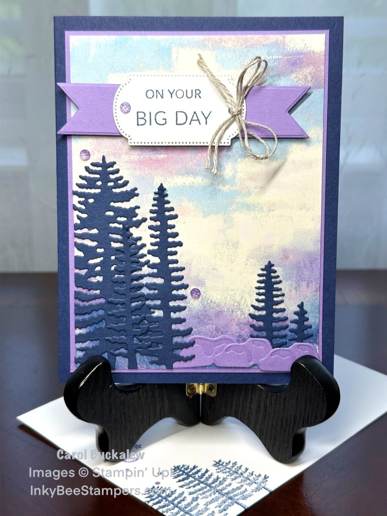 I chose a paper from the Meandering Meadows Designer Series Paper pack that had a muted look in purples and blues. This paper looks just like a distant mountain and sky scene! I trimmed the panel down to 5″ x 3-3/4″ and matted it to a piece of Highland Heather then adhered this to the front of a Night of Navy card base.