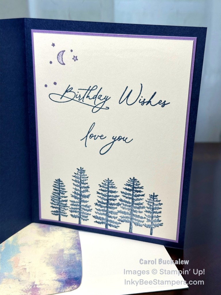 I stamped additional sentiments onto the inside panel in Night of Navy ink from the Everyday Greetings Stamp set, then I stamped the pine trees from the Forever Forest Stamp Set along the bottom of the panel – also in Night of Navy. The star and moon images were stamped towards the top of the panel, just above the sentiment, in Highland Heather ink. The panel was adhered to a Highland Heather mat, then adhered to the inside of the card.