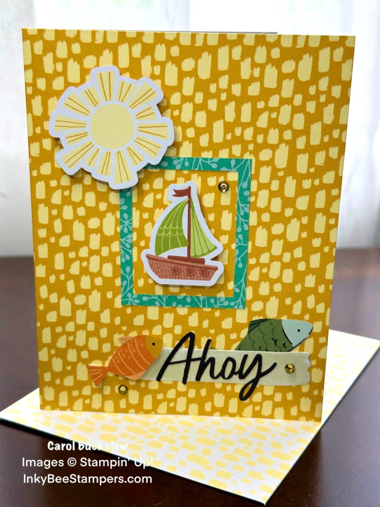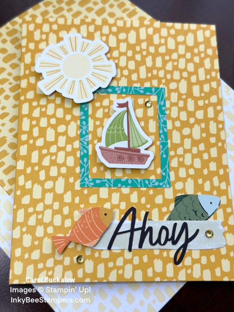 I then turned to the Saying Something and Labels & Layers Ephemera Packs and pulled a couple of sentiments and a label. I also punched out a few fish from the Something for Everything Ephemera Pack. The “Ahoy” punch out sentiment was adhered to a sentiment label, then adhered to the lower right of the card front. I tucked one of the fish behind the sentiment label and the second fish was popped up with Stampin’ Dimensionals.