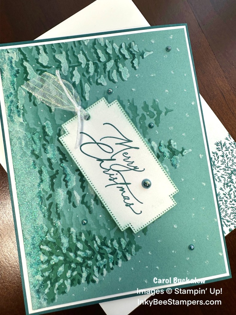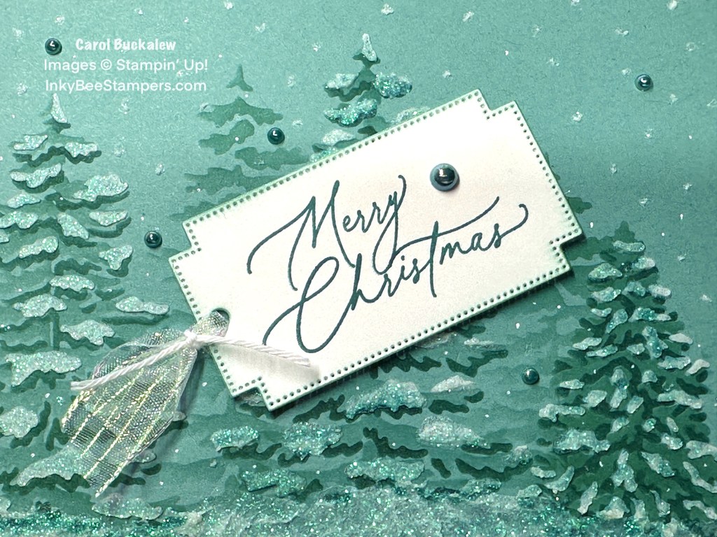 I then used Mask C to apply the Shimmery White Embossing Paste over the three main focus trees (left, center and right). Mask C was cleaned after each application of Embossing Paste before moving onto the next tree. I used the small end of my Stylus to dot some of the Shimmery White Embossing Paste over the entire panel to mimic falling snow and I used my Palette Knife to apply some of the Embossing Paste across the bottom of the panel. The panel was then adhered to a white mat, then adhered to the front of a Pretty Peacock card base. The “Merry Christmas” sentiment label comes from the Greetings of the Season Bundle. I added a short length of Iridescent Striped Trim through the punched hole in the sentiment label and tied it off with a short length of White Baker’s Twine. The sentiment label was adhered to the center of the card front at an angle using Stampin’ Dimensionals.