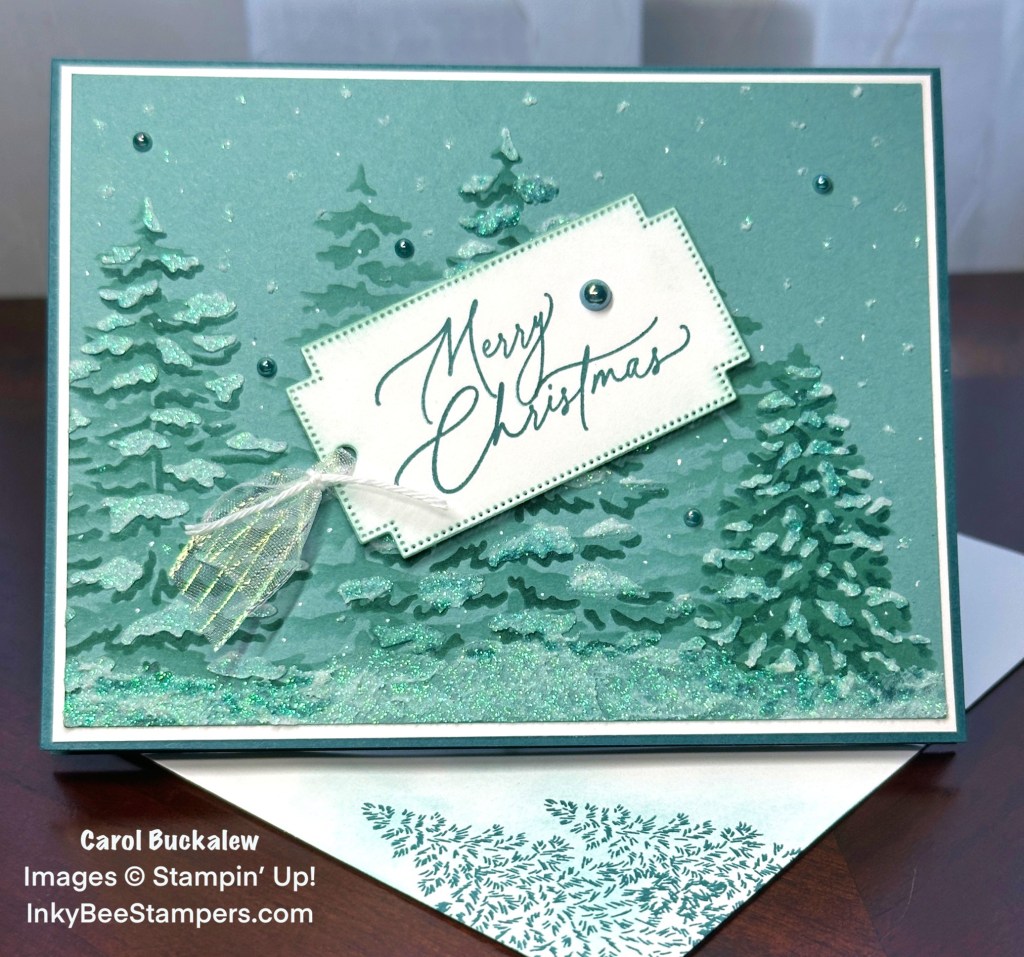 I repeated stamping of the small pine tree image from the Frosted Forest Stamp Set onto the envelope front and envelope flap and used a Blending Brush to lightly blend Pretty Peacock ink around the trees. To finish up the card I adhered multiple Pretty Peacock Blooming Pearls to the card front.