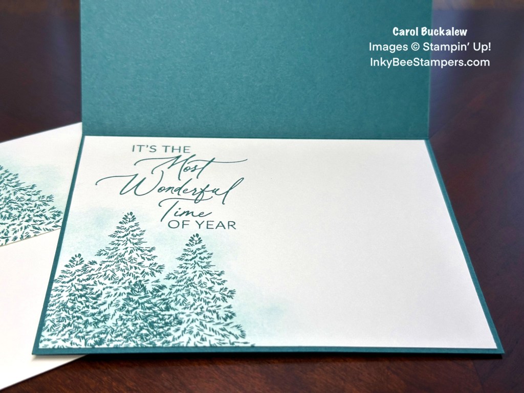 The small pine tree image from the Frosted Forest Stamp Set was used to stamp multiple trees onto the lower corner of the inside panel in Pretty Peacock ink. I then stamped an additional sentiment from the Greetings of the Season Stamp Set – also in Pretty Peacock ink. I then used a Blending Brush to lightly blend Pretty Peacock ink over the trees then the panel was adhered to the inside of the card.
