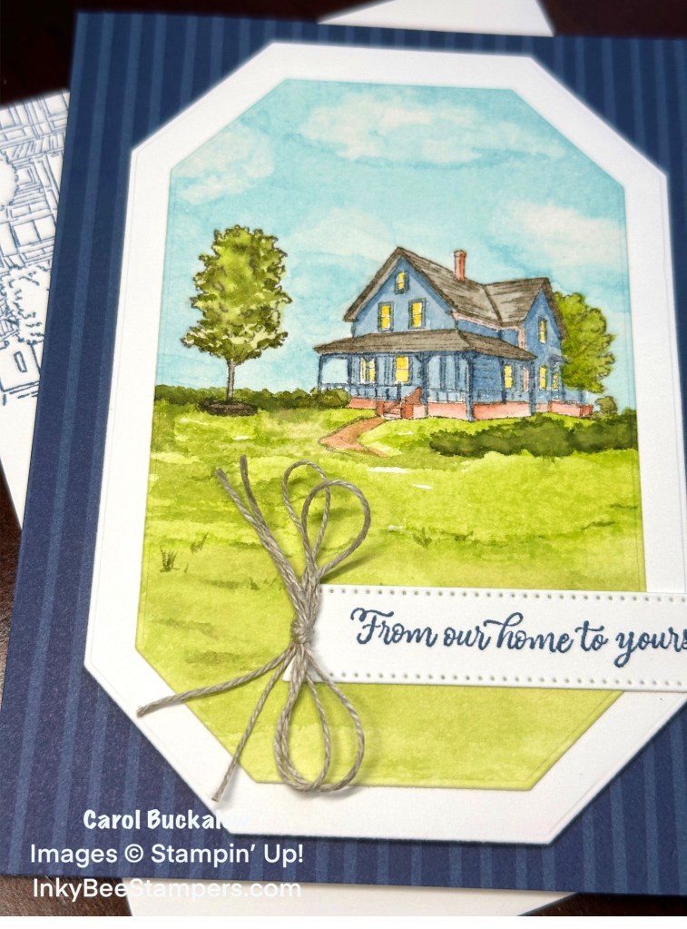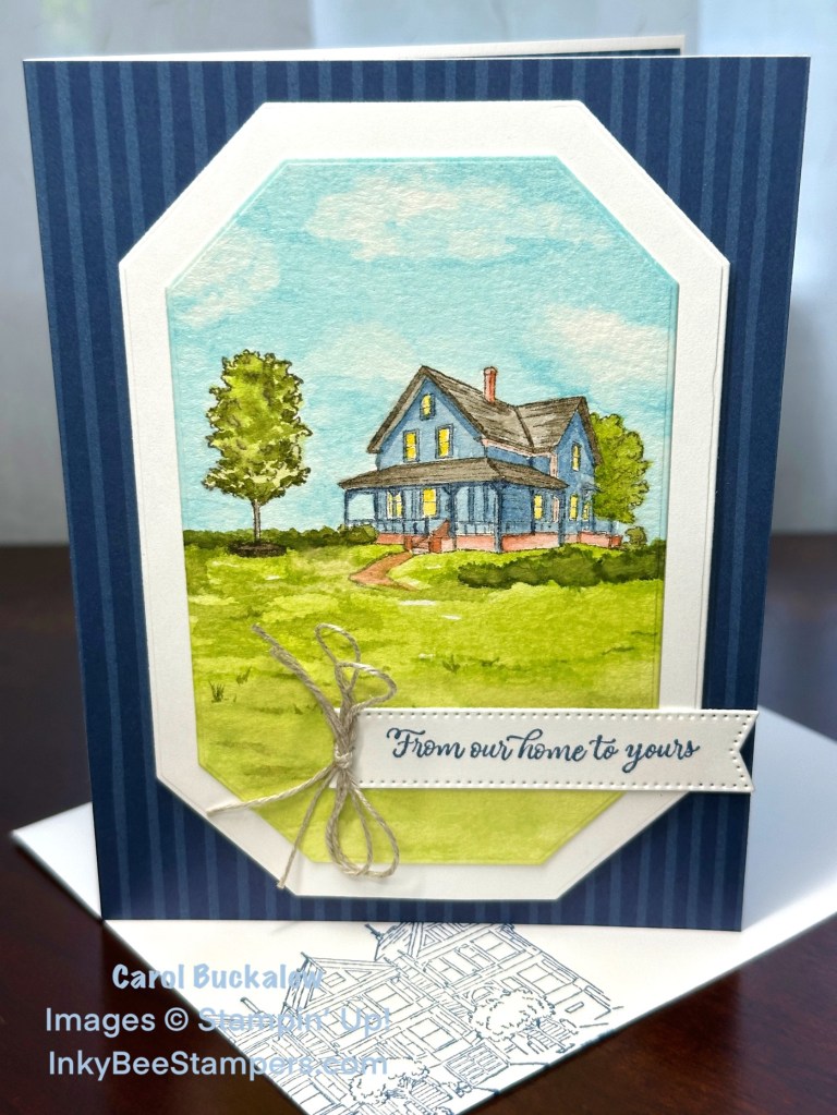 You will find the charming From Our Home Stamp Set in the 2024-2025 Annual Catalog. I fashioned my card after the sample shown in the catalog, but I went with a Night of Navy background instead from the Countryside Inn Designer Series Paper (one of my faves!). I think it really makes the white mat and the water-colored image pop! I have had this stamp set for a while and am just now pulling it out. I was in the mood to watercolor!
