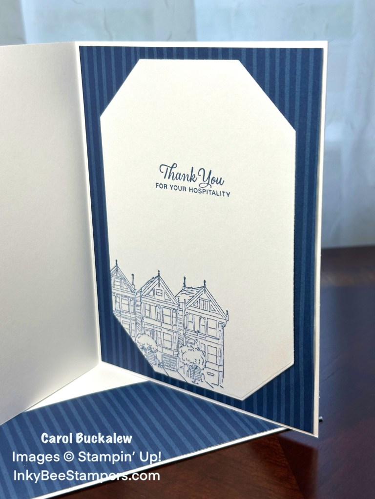On the remaining white octagon panel, I stamped an additional sentiment, then partially stamped the row house image towards the bottom of the panel in Misty Moonlight ink. A piece of the designer series paper was first added to the inside of the card, then the inside panel was adhered on top.