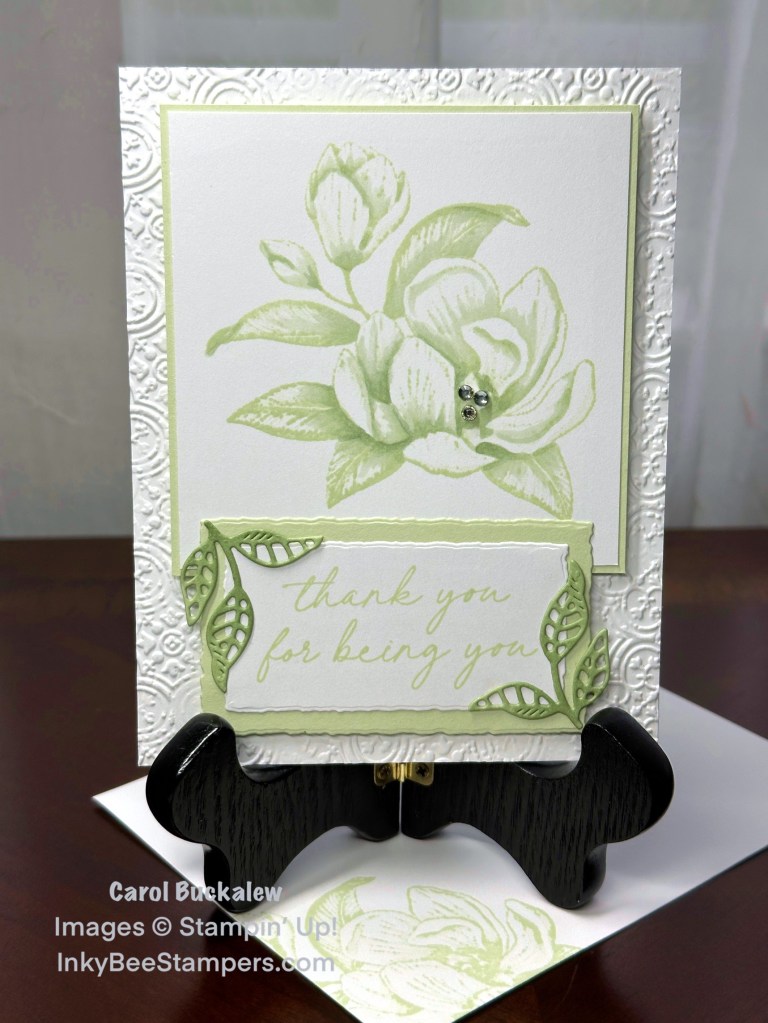 This pretty looking thank you card was created with the Magnolia Mood Bundle and the Distressed Tile 3D Embossing Folder for some added texture! The large Magnolia image in this stamp set is one of the loveliest floral images that you’ll find among Stampin’ Up products! And I love the softness that the Soft Sea Foam accents add to this card. You can find the Magnolia Mood Bundle in the Online Exclusives section of the Online Store. Let’s take a look at the card!