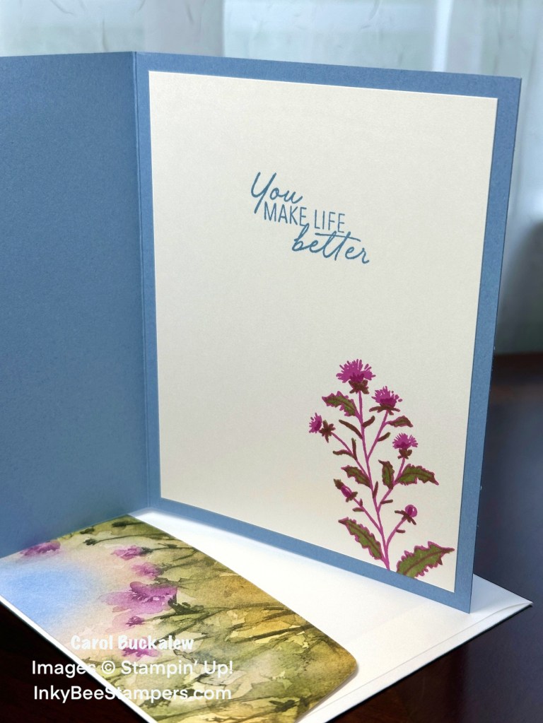 On the inside panel, I stamped a second sentiment from the Thoughtful Wishes Stamp Set in Boho Blue ink, then stamped the thistle image in Petunia Pop ink. I used Petunia Pop and Mossy Meadow Stampin’ Blends to color in the image then the panel was adhered to the inside of the card.