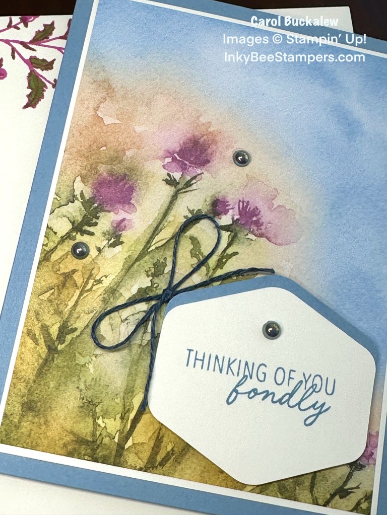I repeated stamping of the thistle image onto the envelope front and colored the image in using Petunia Pop and Mossy Meadow Stampin’ Blends. A coordinating piece of the designer series paper was adhered to the envelope flap, and I trimmed the excess paper away from the flap using a pair of paper snips. I used a Boho Blue Stampin’ Blend to color a length of Linen Thread. Once the thread was completely dry, I tied a small bow and adhered the bow to the card front using a Mini Glue Dot. Three Misty Moonlight Pearls were adhered to the card front.