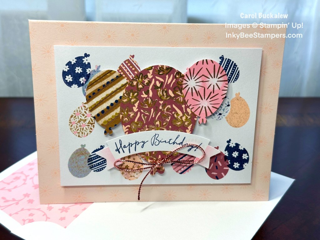 This is the third card design. This card included stamped balloons and punch out balloons which were adhered to the card front using Stampin’ Dimensionals. A pretty cooper trim bow was added to the large balloon in the center of the card. Did you notice the coordinating envelopes for each of the card designs? Yep, the kit included printed, coordinating envelopes!