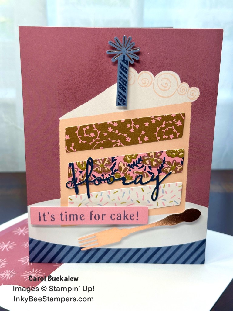 A slice of cake is served up on this fun card! Again, the card includes copper accents (including a fork). The slice of cake was decorated with punch out strips for the cake layers and the sentiment label was included…all I needed to do was stamp the sentiment. By the way, this stamp set included two stamp sets, one of which includes numbers so that you can customize your birthday cards.