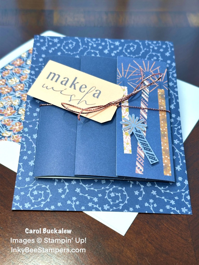 This was a fun fold card that was easy to put together. The card includes copper accents on the candle and the copper trim keeps the fun fold together. This fun fold came pre-scored so it was very easy to fold and adhere to its card base!