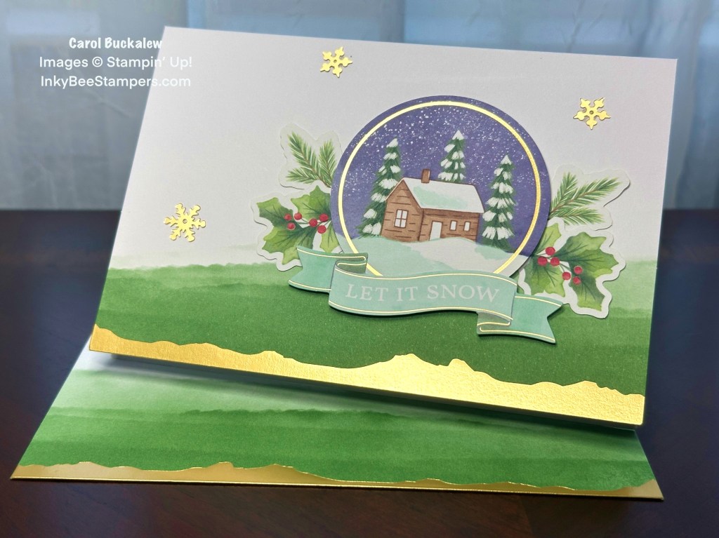 For the card above, I selected the circular scene along with sprigs of pine and holly. The circular piece was adhered to the card front using Stampin’ Dimensionals. The pine and holly sprigs were tucked on either side of the circle and adhered with liquid glue. The sentiment banner was adhered with a combination of liquid glue and Stampin’ Dimensionals. And because every card needs a little bling, I added some Adhesive-Backed Snowflakes to the card front in gold.