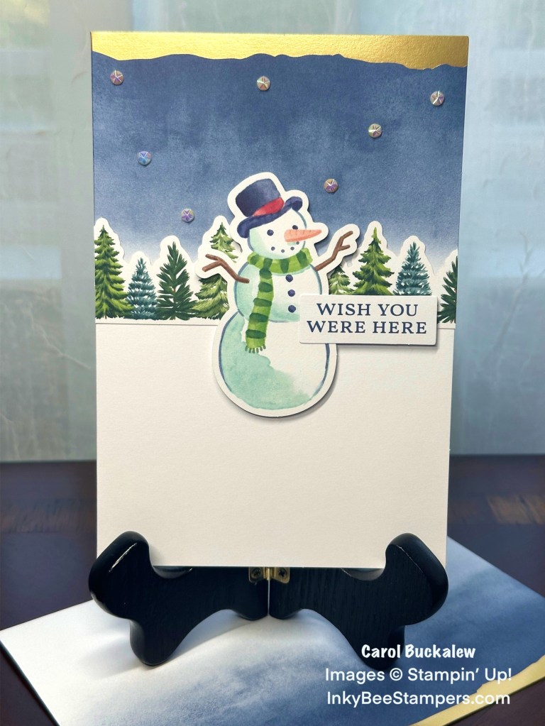 This adorable card used only three pieces. The background pine trees, the snowman and the sentiment! Easy peasy! The snowman and sentiment were popped up with Stampin’ Dimensionals. To mimic snow, I added multiple Iridescent Faceted Gems to the sky for some sparkle.