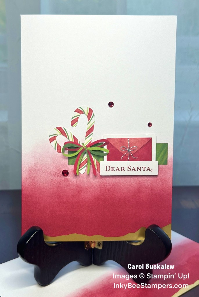 And this last card gives a nod to the big guy in red… Santa! The candy canes and background banner were adhered to the card front using liquid glue. The bow, letter and sentiment label were adhered to the card front using Stampin’ Dimensionals. I used a Cherry Cobbler Stampin’ Blend to color in several Rhinestone Basic Jewels before adhering them to the card. More sparkle!