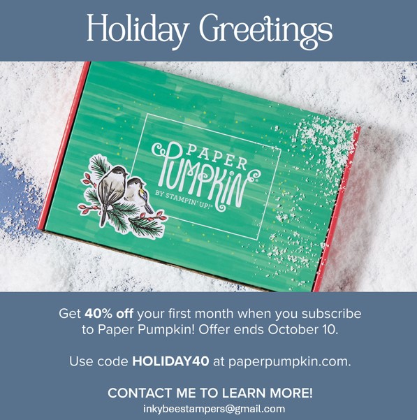 Now that you’ve read through all the details, it’s time to head to paperpumpkin.com to subscribe and use code HOLIDAY40 to get 40% off your first month!  Reach out to me at inkybeestampers@gmail.com with any questions. Click on the image below to subscribe!