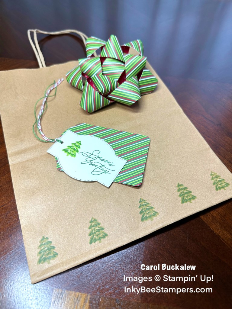 Using the Iconic Imagery Stamp Set, I stamped the small pine tree image across the bottom of my gift bag.