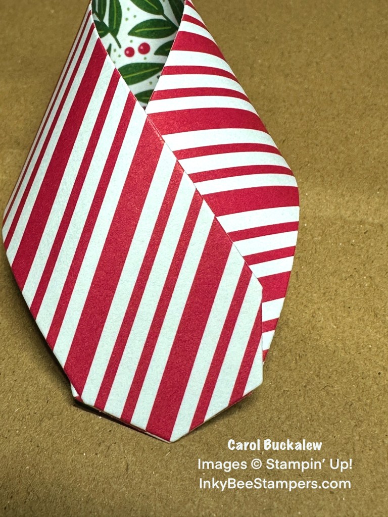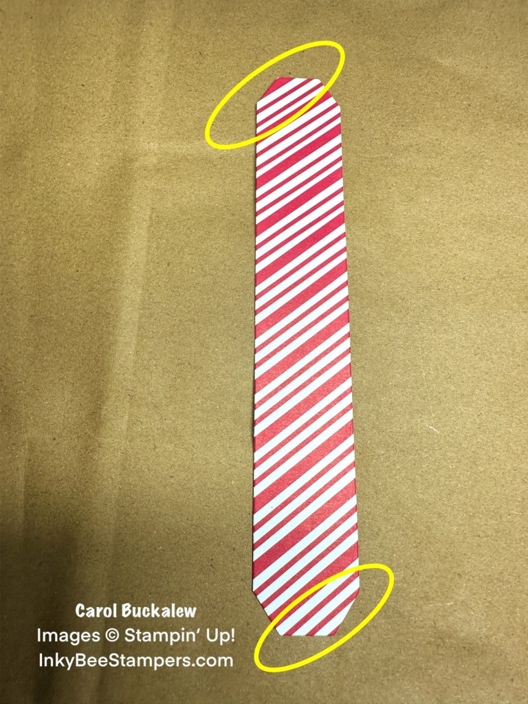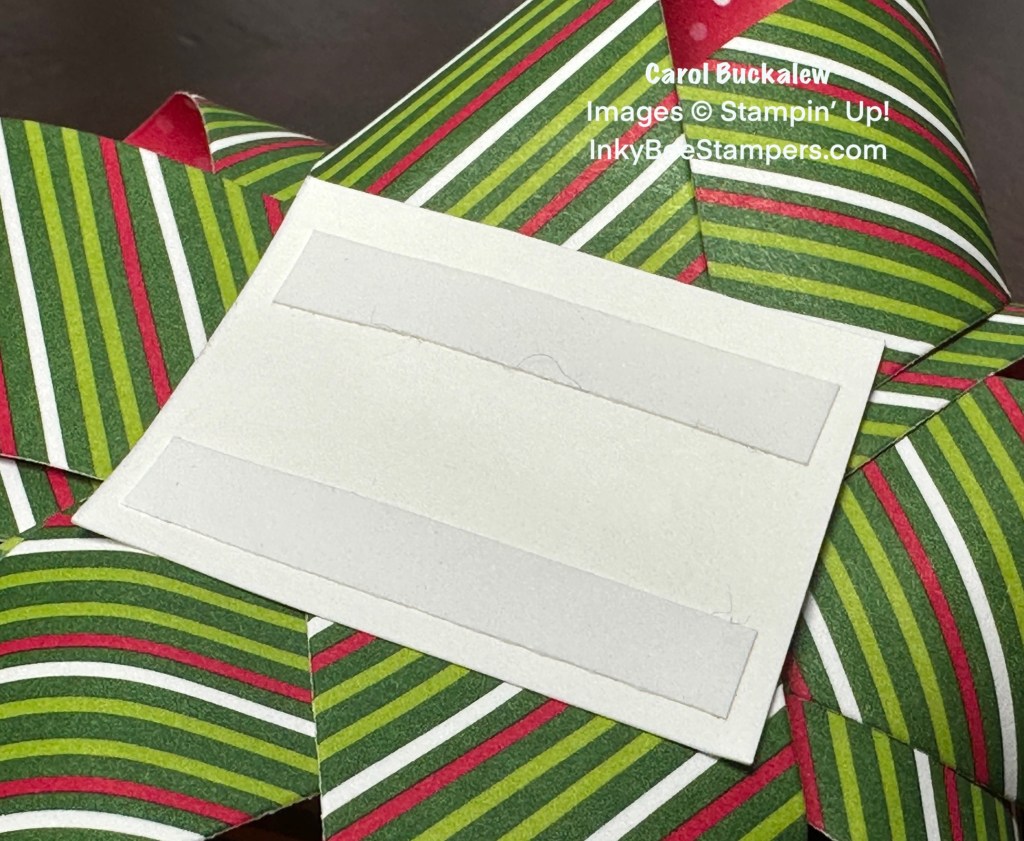 To form a bow section from a strip, you will apply Stampin’ Seal to one end, then bring the opposite end up and adhere the ends together so that the “right” sides of both ends are facing up. The ends are notched so they are easy to line up. Repeat for the remaining bow sections.
