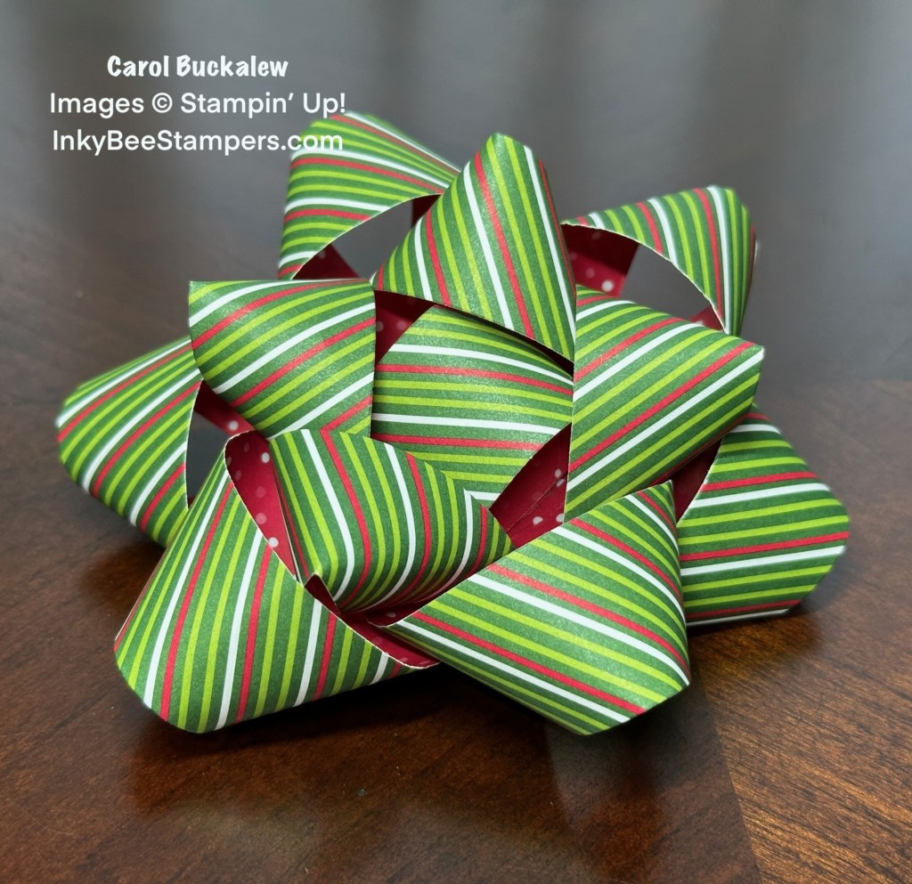I started off by creating my bow. You will need two (2) sheets of 6″ x 6″ Take a Bow Designer Series Paper, and you will need to run the die through your Stampin’ Cut & Emboss Machine two times. Running the Take a Bow Die through two times will give you (6) large strips, (4) medium strips, and (2) small strips. You will only need one small strip for your bow so you can set aside the extra small strip.