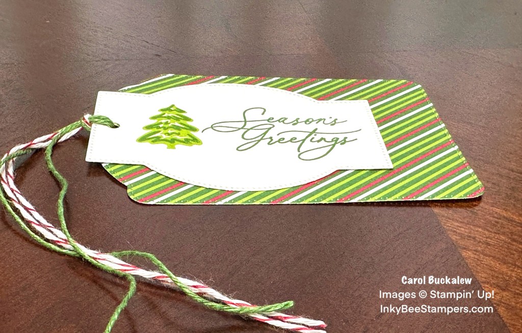 I then created a coordinating gift tag using a piece of the Take a Bow Designer Series Paper, white cardstock, and the Greetings of the Season Bundle. Two 12″ lengths of Natural Tones Linen Thread and Real Red & White Baker’s Twine were looped through the tags.
