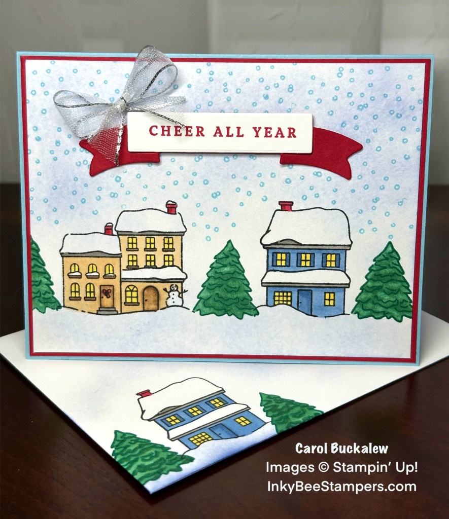 I used the snow stamp from the Yuletide Village Stamp Set to stamp snow in Balmy Blue above the houses and without reinking my Blending Brush I lightly blended Night of Navy ink in front of the houses. For the sentiment label, I chose the ribboned sentiment label die from the Peaceful Season Dies and I cut one white and one Real Red label. Some of the label dies in the Peaceful Season Dies have cutouts in them. On the white ribboned label, I cut away the ribbon ends on each side of the label. I then stamped the “Cheer All Year” sentiment in Real Red ink on the remaining white label. The white label was then adhered to the Real Red label using liquid glue. I applied Stampin’ Dimensionals to the center section of the label unit and a Mini Glue Dot to the ribboned Real Red ends of the unit, then adhered the sentiment onto the panel just above the houses. The combination of Stampin’ Dimensionals and Mini Glue Dots provide some dimension to the sentiment. Without reinking my Blending Brush, I lightly blended Night of Navy ink in front of the houses and beneath the pine trees. The panel was then adhered to a Real Red mat then adhered to the card front.