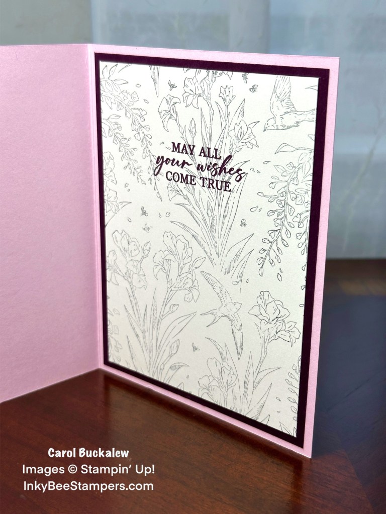 On the inside panel, I second-generation stamped the Among the Swallows image using Tuxedo Black Memento ink. The additional sentiment from the Unbounded Love Stamp Set was stamped in Blackberry Bliss ink. The panel was then adhered to a Blackberry Bliss mat then adhered to the inside of the card.