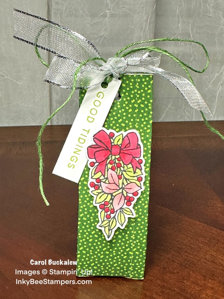 I created these adorable little treat holders using the Sophisticated Sled Bundle and the Take A Bow 6″ x 6″ Designer Series Paper. They measure 1-1/4″ x 1-1/4″ x 4″ and will hold several small fun-sized candy bars, Hershey’s Kisses or even some lip balm! Use them as stocking stuffers, a fun little gift, table placeholders or party favors!