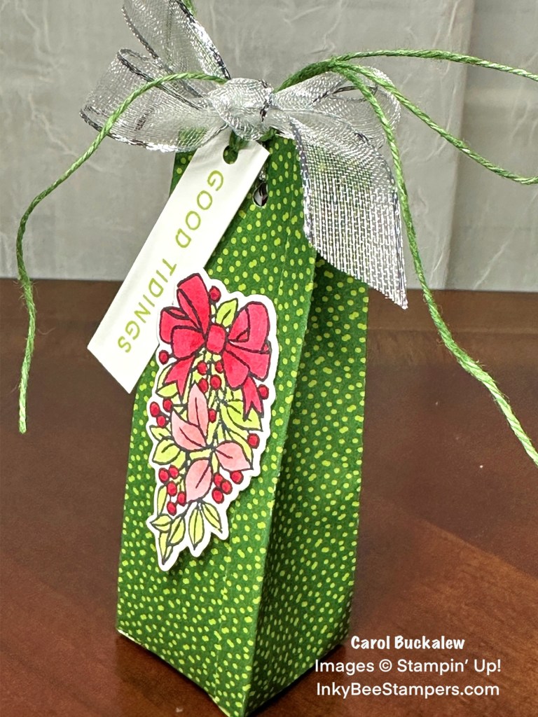 The “Good Tidings” sentiment was stamped in Granny Apple Green ink onto a 1/2″ wide piece of white cardstock. I again used the 1/8″ hole punch to punch a hole at the end of the sentiment label and secured the label with a length of Garden Green Natural Tones Linen Thread to the top of the treat box.