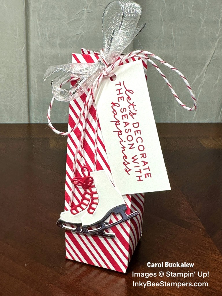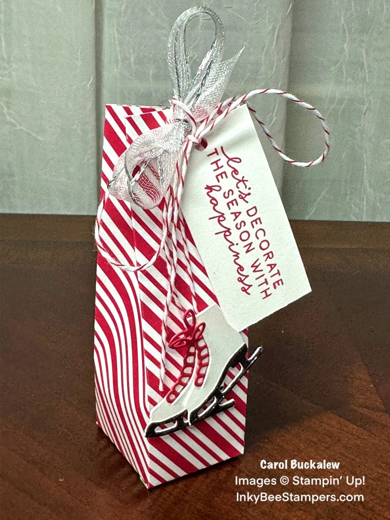 For the next box I selected a Real Red & White diagonal strip print from the Take A Bow Designer Series Paper. The Sophisticated Sled Dies were used to cut out a pair of skates from white cardstock, skate laces from Real Red cardstock, and skate blades from Silver Textured Metallic Specialty Paper. I used liquid glue to then assemble the skates. The skates were adhered together using a Mini Glue Dot, then I attached a length of folded Real Red & White Baker’s Twine to the back of the skates. The skates were then adhered to the front of the treat holder using Stampin’ Dimensionals.