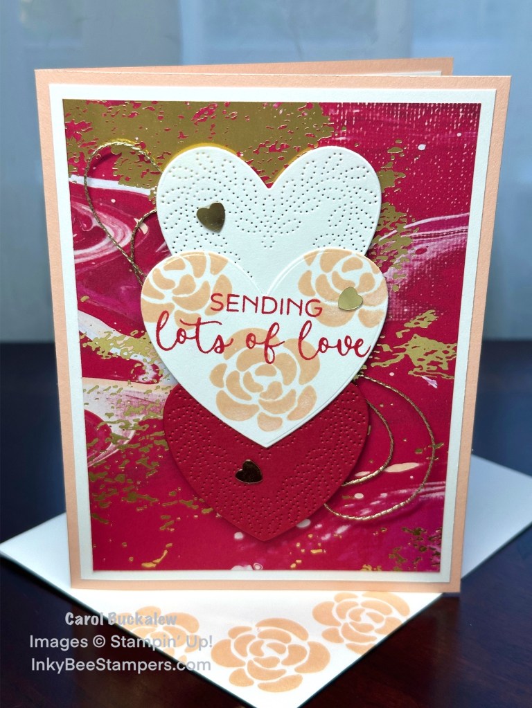 The Hearts of Elegance Dies were used to cut out three hearts. Two of the die cut hearts have a pretty etched leaf detail around the edges and the center heart is plain. I used the solid heart as a sentiment label and stamped the “Sending lots of love” sentiment onto this heart using Poppy Parade ink. I also stamped the rose image from the Hearts of Elegance Stamp Set several times in Petal Pink across this heart. I adhered the hearts together vertically with the sentiment heart on top, then adhered this to the card front using Stampin’ Dimensionals.