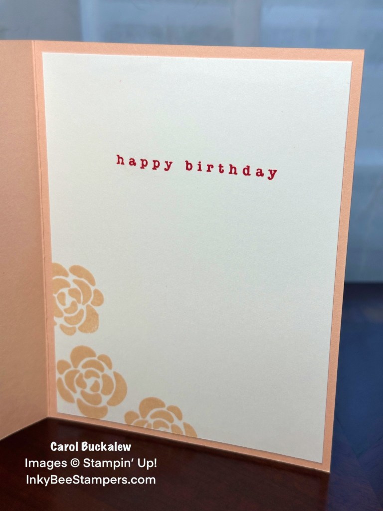 On the inside panel, I stamped the “happy birthday” sentiment from the Country Birdhouse Stamp Set in Poppy Parade ink. The rose image from the Hearts of Elegance Stamp Set was stamped onto the lower corner in Petal Pink ink. The panel was then adhered to the inside of the card.